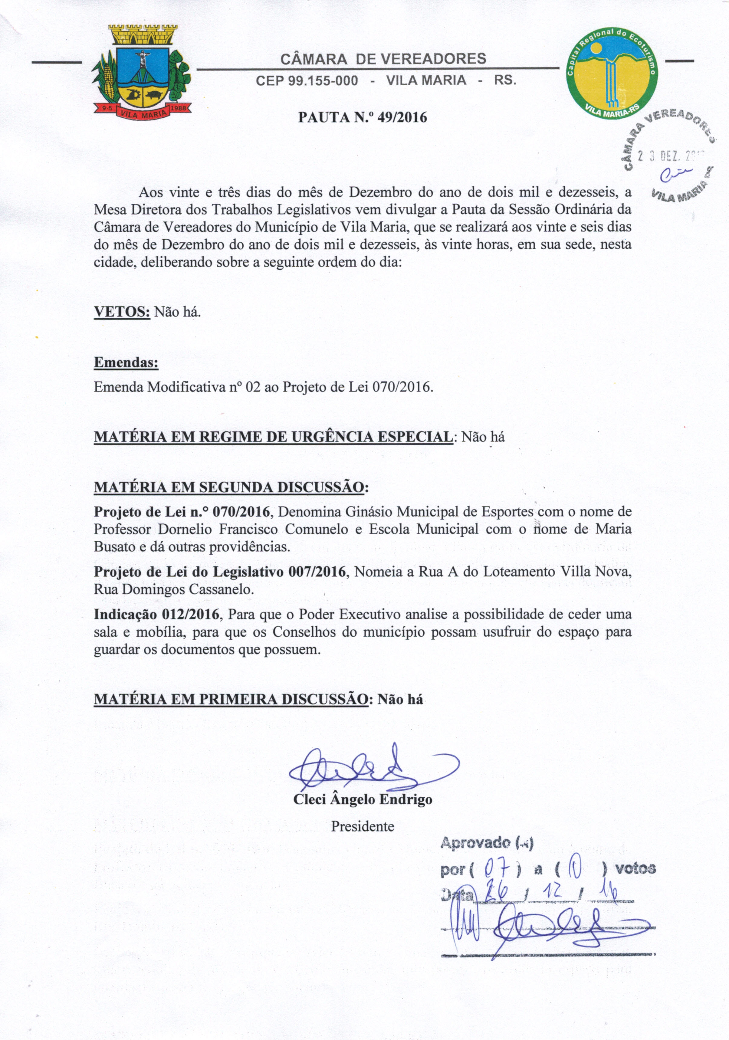 • A Pauta 49/2016 para a Sessão do dia 26/12/2016 foi aprovada pelos vereadores.