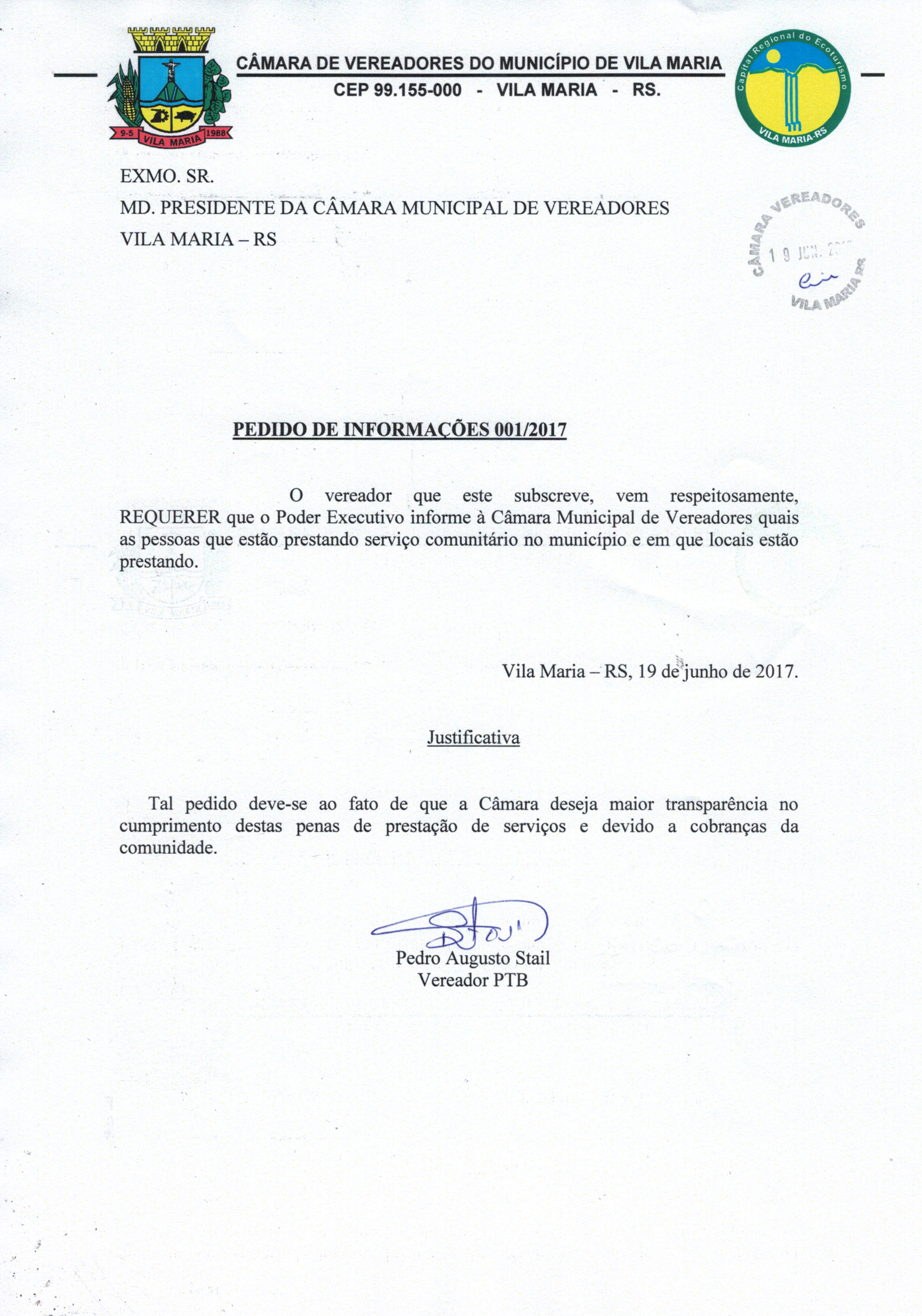 • Pedido de Informação 001/2017, Para que o Poder executivo informe quais as pessoas que estão prestando serviço comunitário no município e em que locais.
